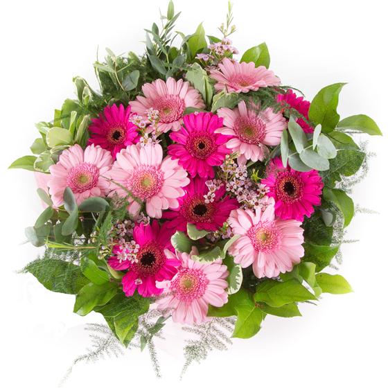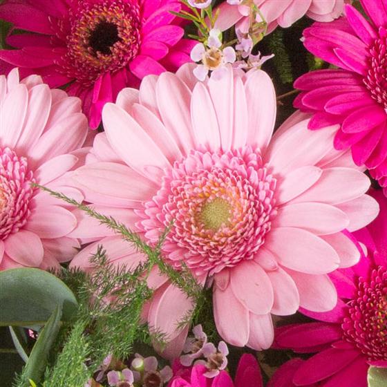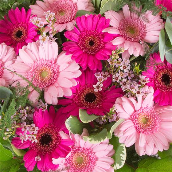 A hand-tied bouquet of cerise and baby pink gerberas accompanied by a selection of mixed foliage.