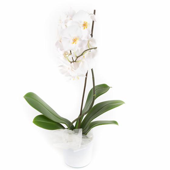 A graceful phalaenopsis orchid presented in a stylish white pot.